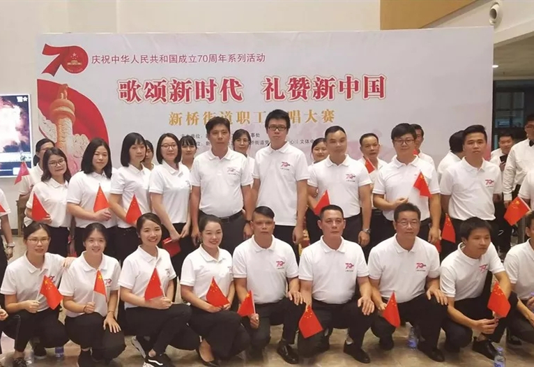 時(shí)光如水,歲月如歌,祖國(guó)70周年華誕即將到來(lái),為強(qiáng)化愛國(guó)之志、激勵(lì)愛國(guó)之情,新橋街道“歌頌新時(shí)代·禮贊新中國(guó)”職工大合唱比賽,于9月27日晚上19:30,在新橋文化藝術(shù)中心大劇院圓滿舉行。上星工作站攜手鴻運(yùn)物業(yè)28名員工,組成上星合唱隊(duì),代表上星社區(qū)參加了此次合唱比賽,現(xiàn)場(chǎng)演唱“我的中國(guó)心”“歌聲與微笑”兩首曲目,最終斬獲佳績(jī),贏得銅獎(jiǎng)。 上臺(tái)后,大家抬頭挺胸,手舉國(guó)旗于心口,現(xiàn)場(chǎng)莊嚴(yán)肅穆,隨著“我的中國(guó)心”前奏響起,隊(duì)員們凝神屏氣,將滿腔的愛國(guó)熱情融入曲目的演唱中。唱完,現(xiàn)場(chǎng)掌聲雷動(dòng)。改編后的“歌聲與微笑”節(jié)奏更加的輕快、靈動(dòng),大家活潑的演唱風(fēng)格、燦爛的微笑,將現(xiàn)場(chǎng)氛圍帶到了頂點(diǎn),臺(tái)下觀眾紛紛跟著節(jié)拍揮舞熒光棒。完成表演后,大家紛紛表示非常的盡興,并為觀眾的熱情互動(dòng)倍感鼓舞。 在此,感謝新橋街道總工會(huì)舉辦此次活動(dòng),感謝上星工作站對(duì)此次合唱的用心安排,也感謝黃老師對(duì)合唱隊(duì)的諄諄教導(dǎo)!我們沒(méi)有扎實(shí)的演唱功底,缺乏成熟的演唱技巧,你因材施教,教會(huì)了我們用情感去打動(dòng)人心,用歌曲去表達(dá)鴻運(yùn)物業(yè)這個(gè)團(tuán)體的愛國(guó)熱情。最后,鴻運(yùn)物業(yè)在此祝大家國(guó)慶快樂(lè),祝祖國(guó)母親永遠(yuǎn)繁榮富強(qiáng)!